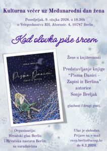 Berlin/ Hrvatski glas Berlin i Hrvatska nastava Berlin sa suradnicima organiziraju danas, 09.03. u 18 i 30 sati u Veleposlanstvu Republike Hrvatske, kulturnu večer uz Međunarodni dan žena naslova “Kad olovka piše srcem”.