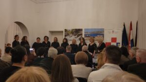 Potom je pažnju brojnih posjetitelja koji su tu večer potpuno ispunili prostor Veleposlanstva, zaokupila glazba. Pjevačka skupina Hrvatske zajednice Berlin otpjevala je pjesmu “Zbogom dragi, pratila te srića”.