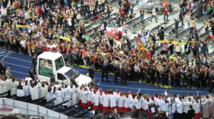 S druge strane stadiona, u odjeljku P, točno preko puta novinarskih tribina, velika skupina Hrvata. Hrvatska katolička misija podijelila je oko 1800 besplatnih ulaznica. No na ovom događaju Hrvati …kao ni ja sama …nisu samo vjernici i promatrači kao prije 15 godina. Već i sudionici. Dogodile se promjene. Na stadionu nastupio, predivno pjevao… Zbor mladih Hrvatske katoličke misije. Zborom s puno žara ravna naša Suzana. Naše djevojke, Marija, Ana i Matea, govorile o tome kako žive mladi stranci, katolici u Berlinu, kako žive Hrvati.